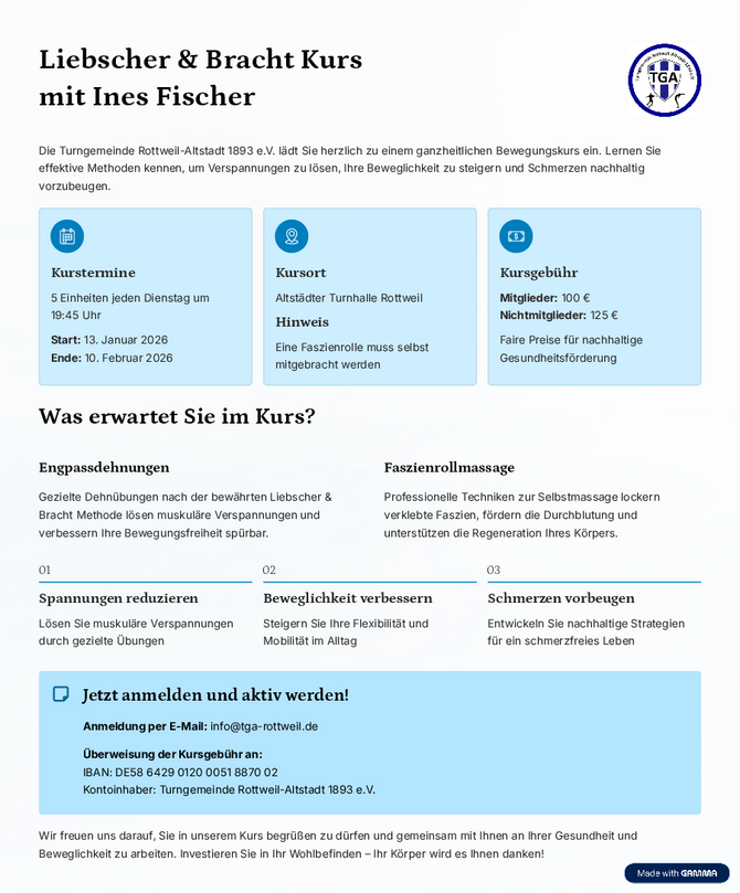 Die Turngemeinde Rottweil-Altstadt 1893 e.V. lädt Sie herzlich zu einem ganzheitlichen Bewegungskurs ein. Lernen Sie